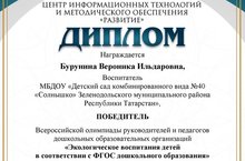 "Мәктәпкәчә белем бирүнең федераль дәүләт стандартларын тормышка ашыру" дигән фәнни-гамәли конференция кысаларында "балаларга экологик тәрбия бирү федераль дәүләт стандартына ярашлы рәвештә" Бөтенроссия олимпиадасында җиңүче (29.10.21 ел), Мәскәү шәһәре.