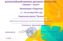 Воспитанники группы компенсирующей направленности №5 "Лучики" приняли участие во Всероссийском конкурсе "Знание - сила!" от ГАУ ДПО ИРО Республики Беларусь и отмечены сертификатом. Поздравляем!