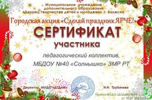 Участники городской акции "Сделай праздник ярче!" г.Волжск. Педагоги и воспитанники групп отмечены сертификатами.