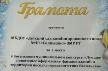 Безнең балалар бакчасы "Васильево шәһәр тибындагы бистәсе биналарының фасадларын һәм территорияләрен иң яхшы Яңа ел бизәлеше"муниципаль конкурсында 1 урынны алды.