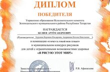 Безнең балалар бакчасы мөмкинлекләре чикләнгән балалар өчен "мин бу дөньяны ясыйм"муниципаль рәсем конкурсында катнашканы өчен рәхмәт хаты белән бүләкләнде. Бу конкурста "Лучики" компенсацияләү юнәлешендәге 5 нче төркемдә тәрбияләнүче Беляев Артем җиңүче булды! Шулай тотарга!