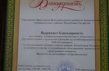 Коллективу МБДОУ №40 "Солнышко" вручена благодарность за активное участие в методических объединениях воспитателей групп раннего возраста за подписью Заместителя руководителя-Начальника УО ИК ЗМР РТ - Р.В.Афанасьевой.