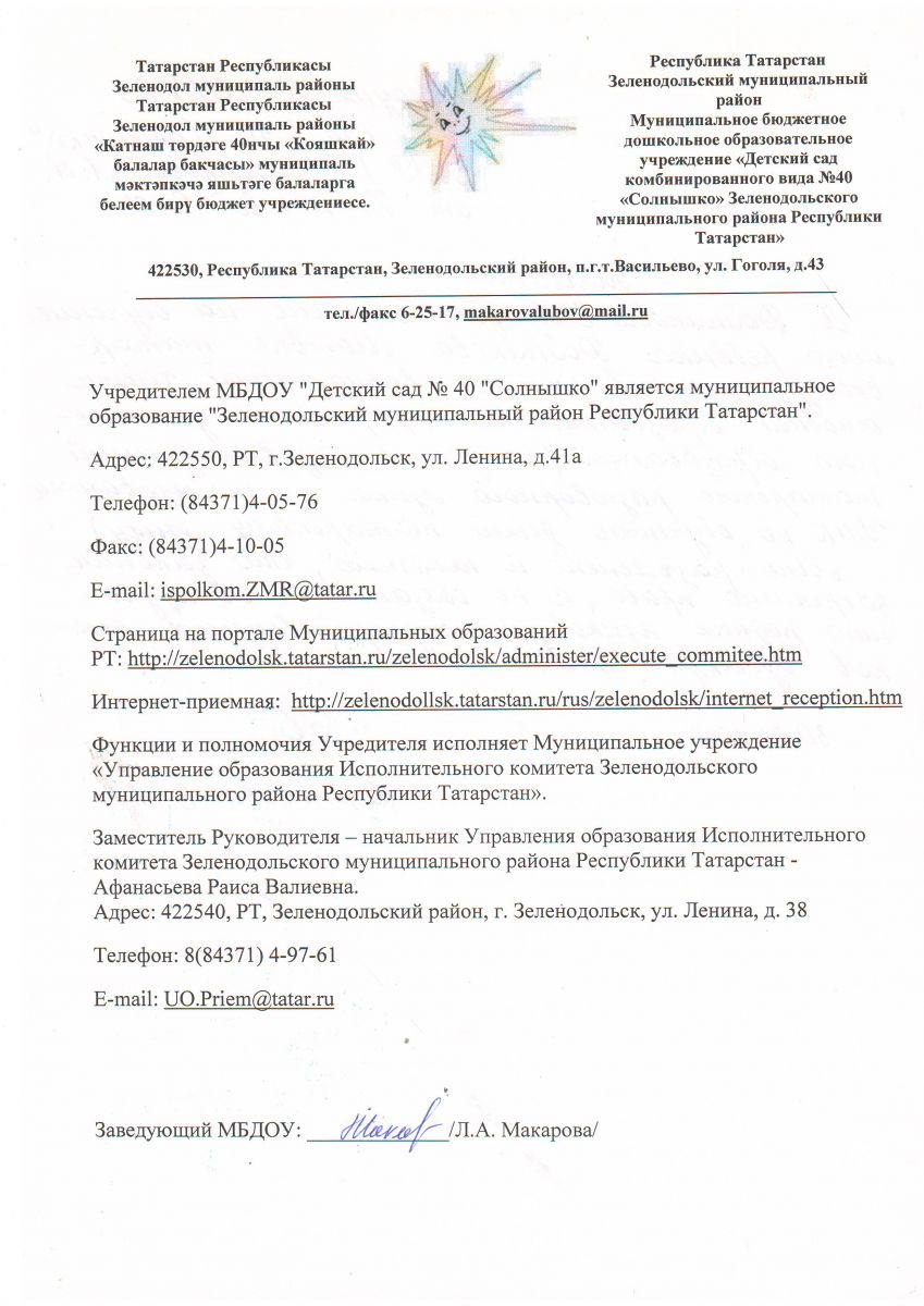 Муниципальное бюджетное дошкольное образовательное учреждение "Детский сад комбинированного вида №40 "Солнышко" Зеленодольского муниципального района Республики Татарстан"/Татартан Республикасы Зеленодол муниципаль районы "Катнаш төрдәге 40 нчы "Кояшкай" балалар бакчасы" муниципаль мәктәпкәчә яшьтәге балаларга белем бирү бюджет учреждениясе"