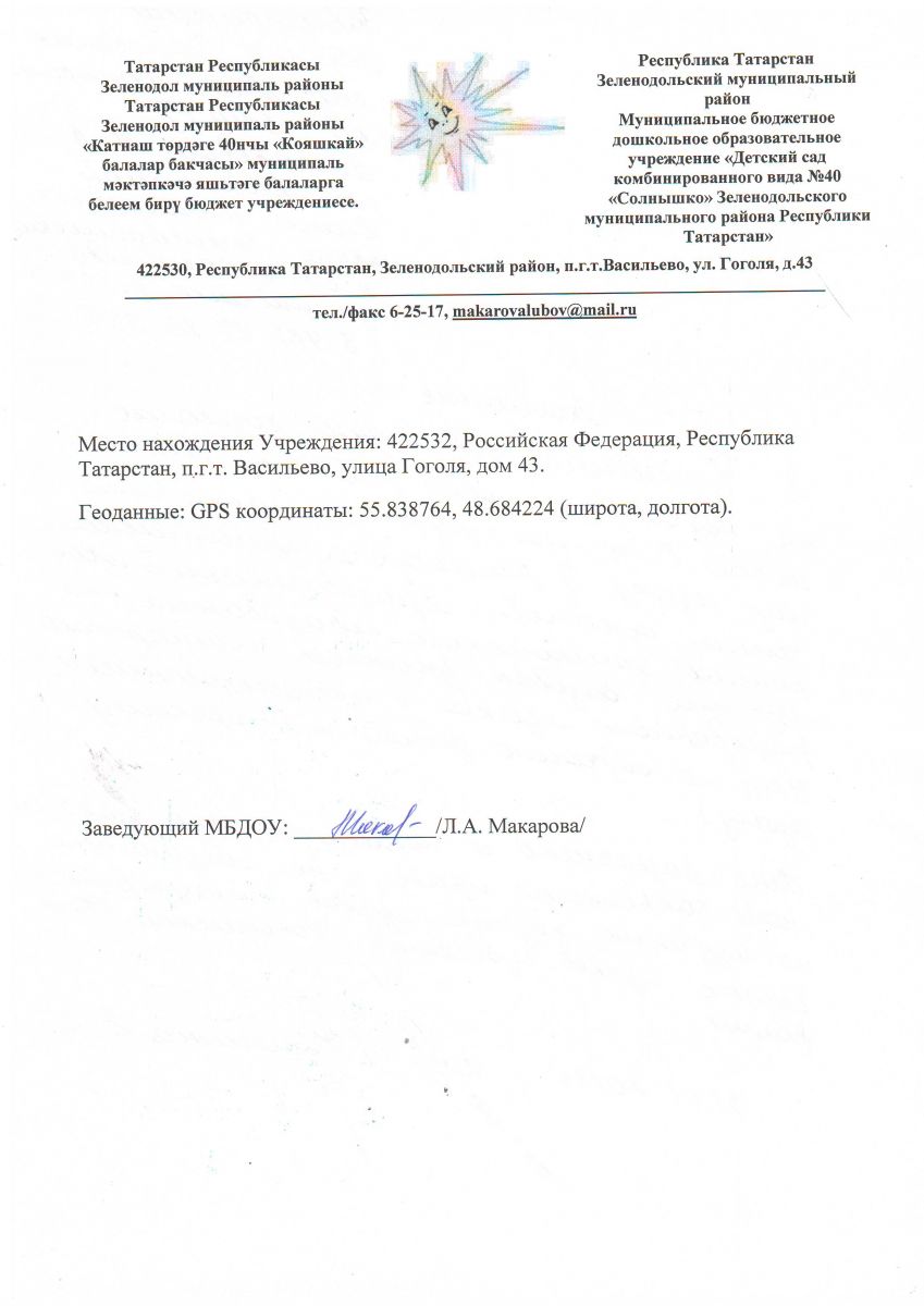 Муниципальное бюджетное дошкольное образовательное учреждение "Детский сад комбинированного вида №40 "Солнышко" Зеленодольского муниципального района Республики Татарстан"/Татартан Республикасы Зеленодол муниципаль районы "Катнаш төрдәге 40 нчы "Кояшкай" балалар бакчасы" муниципаль мәктәпкәчә яшьтәге балаларга белем бирү бюджет учреждениясе"