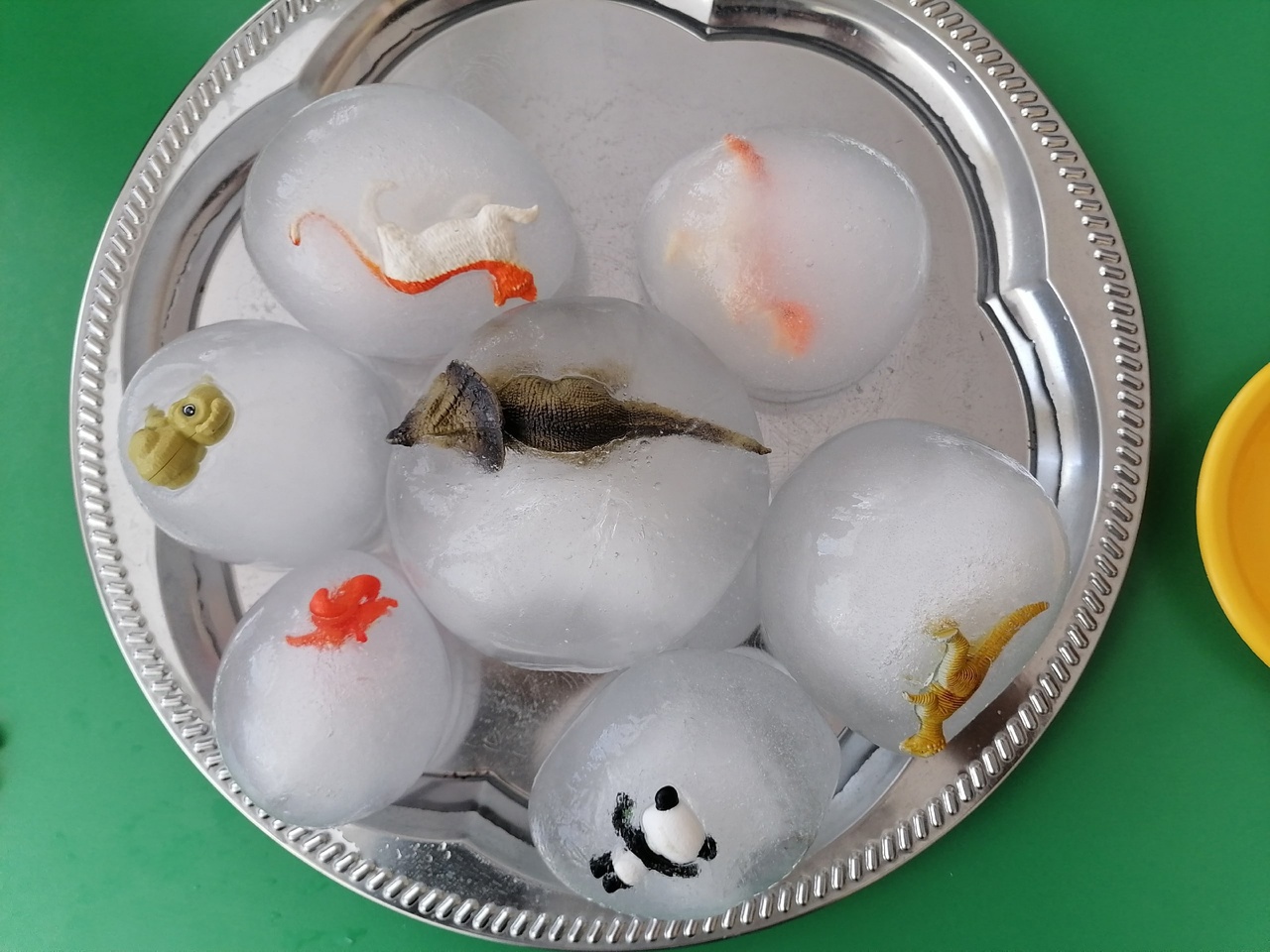 Дети обожают игры с песком и водой, а так же к ним можно добавить и эксперименты со льдом. Игру со льдом можно разнообразить, если заморозить, например, динозавров внутри воздушных шариков. У вас получатся ледяные яйца с динозаврами внутри. С ледяными яйцами можно играть, как динозавры вылупляются в наше время, как они уживаются с современными животными.