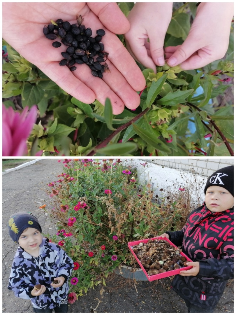 Опубликовано: 21.09.2023Сегодня день выдался достаточно теплый. С большим интересом ребята с воспитателем потрудились на участке, собирая семена цветов, чтобы посеять их в следующем году. Мы собрали семена бархатцев, ночной красавицы, цинний. На следующий год у нас непременно сохранятся эти семена красивых цветов! И мы их с ребятами непременно посадим!