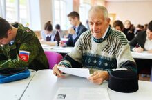 Вместе с учащимися и педагогами, Диктант Победы в свои 87 лет писал Гизатуллин Шаукат Зиннатович, награжденный знаком "Жителю блокадного Ленинграда".