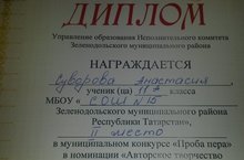 На базе лицея № 9 состоялись два больших муниципальных конкурса, в которых приняли участие и учащиеся нашей школы: "Живая классика" и "Проба пера". Суворова Анастасия, ученица 11 а класса,заняла 2 место в самой многочисленной секции - "Авторское творчество. Поэзия", членами жюри которой были профессиональные поэты и поэты-любители. Остальные участники - Хайруллина Эвелина 6 в, Хамидуллин Ильназ 6 г, Шишкина Александра 7 а - читали отрывки из произведений, не входящих в школьную программу, в рамках проекта "Живая классика" и получили грамоты за активное участие. Учителя, подготовившие детей к большому празднику поэзии и прозы, - Можаровская Н.В., Лёвочкина С.А., Самсонова Л.А.