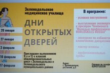 Ученики 9 и 11 классов, желающие поступать в Зеленодольское медицинское училище, приглашаются 3 февраля на День открытых дверей. Предоставляется отличная возможность получить полную информацию о специальностях обучения, об условиях поступления, а также встретиться с администрацией и преподавателями.ПРОФОРИЕНТАЦИЯ.