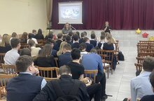 Бүген Фесенко Ирина Владимировна - иҗат үзәге директоры, Бала хокуклары буенча вәкил, шулай ук шәһәр Советы депутаты өлкән сыйныф укучылары белән әңгәмә һәм профориентация үткәрде.