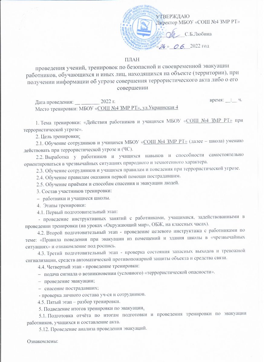 План проведения учений, тренировок по безопасной и своевременной эвакуации работников, обучающихся и иных лиц, находящихся на объекте (территории), при получении информации об угрозе совершения террористического акта либо о его совершении