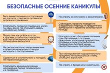 Внимание, осенние каникулы! Уважаемые родители! Наступили первые каникулы в 2025-2026 учебном году, с 27 октября по 6 ноября 2025г. Это приятное время для школьников и время особой заботы для взрослых. Чтобы сохранить здоровье детей в осенние каникулы, обсудите с ними основные правила безопасного поведения. Чтобы избежать непредвиденных ситуаций, убедительно просим позаботиться о безопасности детей. Помните, что в это время значительно увеличивается риск уличного и бытового травматизма. Отправляя детей на улицу, напомните им правила дорожного движения, еще раз расскажите об опасностях мокрых осенних дорог. Оставляя детей дома, повторите с ними все меры безопасного поведения в быту. Строго контролируйте свободное время ваших детей, наполните день интересными и полезными делами и событиями. Учащимся напоминаем инструктажи по безопасному поведению в период осенних каникул: соблюдать правила дорожного движения в осеннее время. Быть осторожными и внимательными во время движения по дороге, особенно в темное время суток. Не разговаривать с незнакомыми людьми, не садиться в незнакомый транспорт. Осторожно обращаться с газовыми и электроприборами, предметами бытовой химии, лекарственными препаратами. Не подходить, не трогать руками подозрительные предметы. В случае обнаружения сообщить родителям и в полицию. Находясь дома, не открывать дверь незнакомым людям. Не пребывать на водоёмах в период осенних каникул. Всегда сообщать родителям о своем местонахождении. Не находиться на улице после 22.00 часа без сопровождения родителей (законных представителей). Соблюдать правила поведения в общественных местах. Не увлекайтесь длительным просмотром телевизора, многочасовой работой за компьютером, телефоном в интернете. Напоминаем телефон службы МЧС: 101, 112. Первый учебный день: 07.11.2025 г 07.11.2025