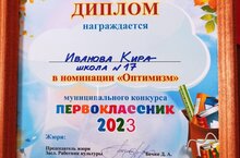 Сегодня состоялся муниципальный конкурс "Первоклассник 2023". Поздравляем Иванову Киру за победу в номинации "Оптимизм".