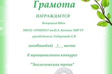 Поздравляем воспитанника дошкольного отделения Войцицкого Ивана с победой в муниципальном конкурсе "Экологическая тропа". Руководитель: Товарищева Е.В.