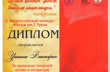 С 21-24 апреля прошел V Всероссийский конкурс чтецов им Г.Тукая. В наминации "За пропаганду татарской поэзии и литературы" победила ученица 3 класса Уткина Виктория . Поздравляем!!!