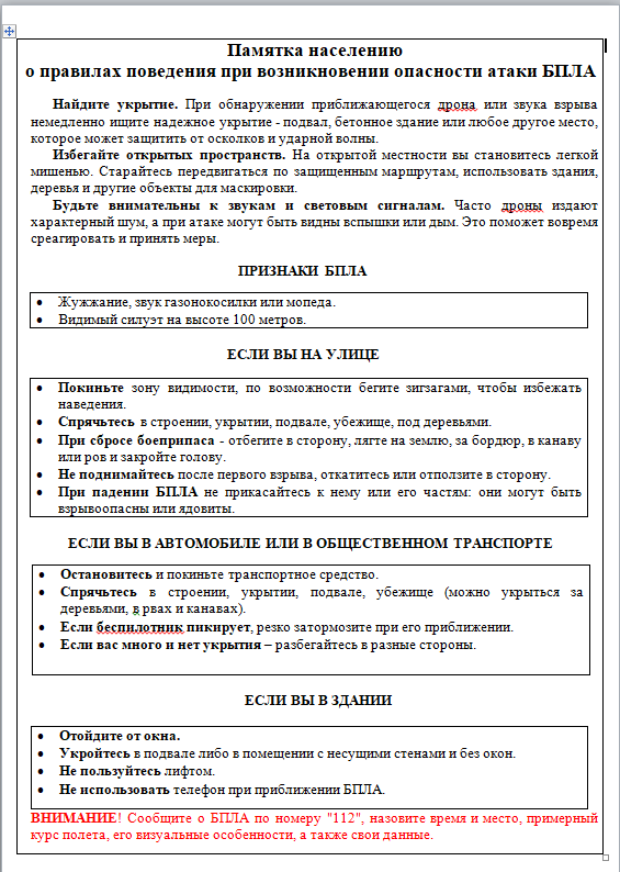 Памятка населению о правилах поведения при возникновении опасности атаки БПЛА