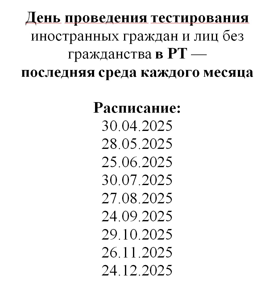 День проведения тестирования иностранных граждан и лиц без гражданства в РТ — последняя среда каждого месяца