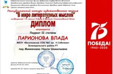Поздравляем учащихся нашей школы Ларионову Владу 4в класс и Кадникову Елизавету 6а класс,которые стали Лауреатами 2 степени Республиканского конкурса художественного чтения "В мире литературных мыслей", посвященного 75-летиюПобеды
