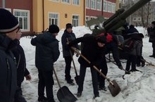 Отряд Юнармия нашей школы , педагоги приняли участие в патриотическом субботнике "Народное дело" по уборке территории и очистке танков от снега у обелиска нашего поселка.