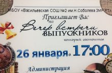 Уважаемые выпускники Васильевской средней общеобразовательной школы №2 им.Героя Советского Союза Николая Соболева ЗМР РТ ! Приглашаем вас на торжественный и традиционный Вечер встречи школьных друзей, который состоится 26 января 2019г 17.00ч в актовом зале школы.