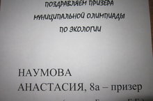 ПОЗДРАВЛЯЕМ ПРИЗЕРА ОЛИМПИАДЫ ПО ЭКОЛОГИИ НАУМОВУ АНАСТАСИЮ УЧЕНИЦУ 8 А КЛАССА