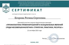 Социаль педагог Егорова Р.С. «Балигъ булмаганнар арасында хокук бозуларны һәм асоциаль күренешләрне профилактикалау: стратегияләр, практикалар, ресурслар»дип аталган фәнни-гамәли семинарда катнаша. Бу чара яшьләр арасында тискәре күренешләрне булдырмау өлкәсендә тәҗрибә һәм белемнәр белән уртаклашу максатыннан оештырылды. Семинарда катнашучылар фикер алышуларда актив катнаштылар, хокук бозуларны профилактикалау буенча төрле стратегияләр һәм эш ысуллары турында фикер алыштылар. Бу семинар яңа идеяләр һәм практик карарлар чыганагына әверелде, балаларны һәм яшүсмерләрне яклау һәм үстерү буенча үз миссиясен нәтиҗәлерәк үтәргә ярдәм итте.