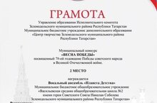 Руководители Щербакова О.С., Шамукова Л.В.3 «А»сыйныф укучылары, Бөек Ватан сугышында совет халкының Җиңүенең 78 еллыгына багышланган «Җиңү язы» муниципаль конкурсының "Балачак планетасы" вокаль ансамбле мәктәпкә 2 нче урынын алып кайттылар. Җитәкчеләре Щербакова О.С., Шамукова Л.В.