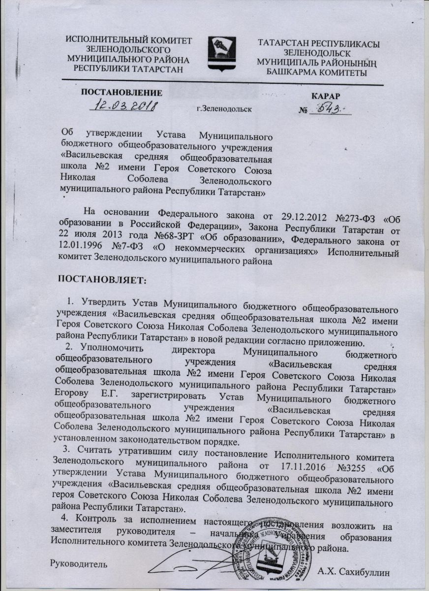 Устав "МБОУ Лицей № 2 им.Н.Соболева пгт.Васильево ЗМР РТ"