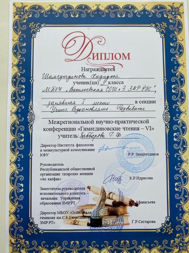 Сегодня в Осиновской гимназии прошла Межрегиональная научно-практическая конференция «Гиматдиновские чтения-VI”С нашей школы участвовала ученица 9 класса Шамсутдинова Хадиджа и заняла 1 место в секции « Учить. Вдохновлять. Развивать». Руководитель:Заббарова Г. Ф. Поздравляем!