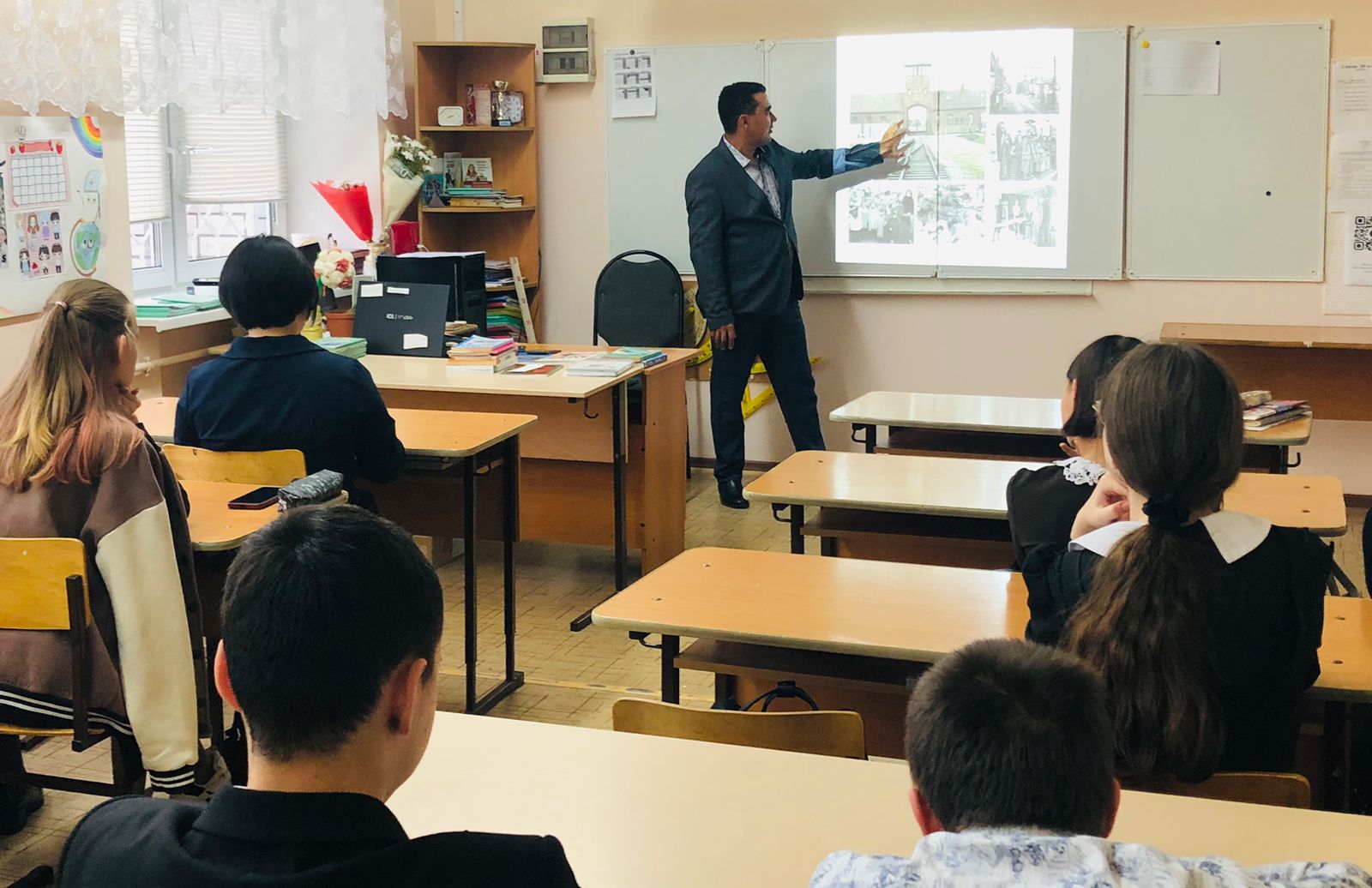 И заплативших за геройство жизнью.Бүген тарих укытучысы Рухин Ф.Ф. белән берлектә тәрбия буенча директор киңәшчесе җитәкчелегендә Фашизм корбаннарын искә алу көненә багышланган сыйныф сәгате узды.