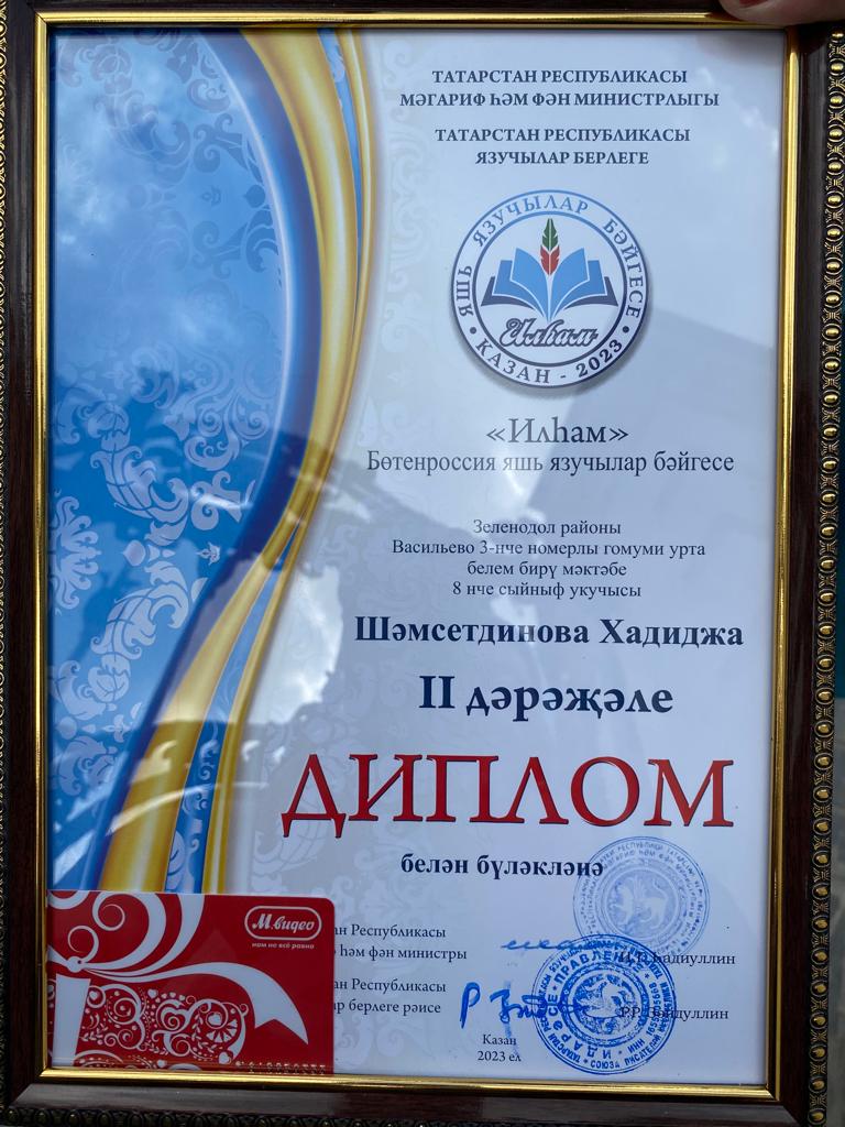Мәктәбебезнең 8 класс укучысы Шәмсетдинова Хәдичә "Илһам" Бөтенроссия яшь язучылар бәйгесендә җиңеп, 2 урын алды. Укытучысы Эльза Шарифяновнаны һәм Хәдичәне чын күңелдән зур җиңү белән котлыйбыз!