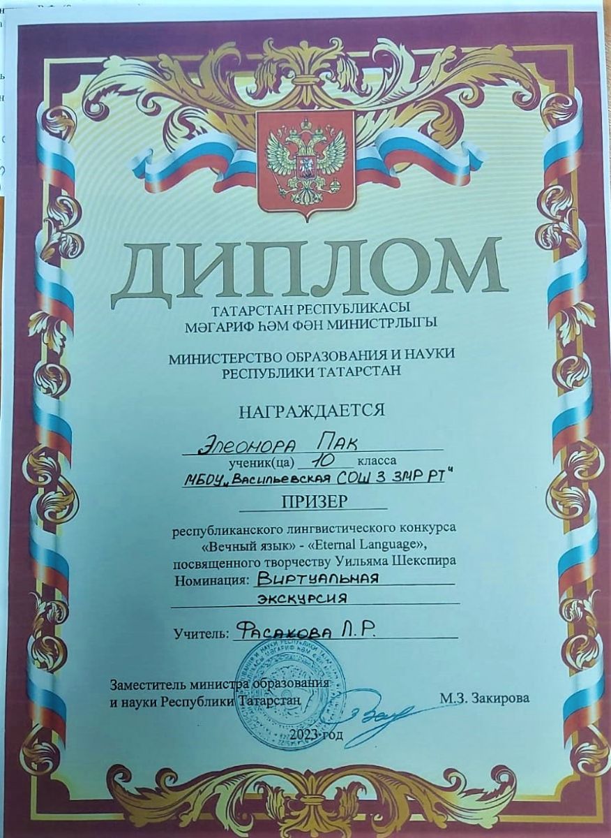 10 нчы сыйныф укучысы Пак Элеонора Уильям Шекспир иҗатына багышланган "Мәңгелек тел" - "Eternal Language" Республика лингвистик конкурсында "Виртуаль экскурсия"номинациясендә призер булды. Укытучы Фасахова Л. Р. Котлыйбыз!
