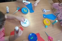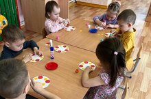 Учимся располагать узор по краю круга, правильно чередуя фигуры по величине; составляем узор в определённой последовательности: вверху, внизу, справа,слева- большие круги, а между ними- маленькие. Закрепляем умение намазать клеем всю форму. Развиваем чувство ритма, самостоятельность. Группа "Цыплята". Воспитатель Камалова З.Г. «Түгәрәктәге үрнәк» аппликация. Түгәрәк кырыенда рәсем урнаштырырга өйрәнәбез, фигураларны зурлыгы буенча дөрес чиратлашып; билгеле бер эзлеклелектә үрнәк төзибез: өстә, аста, уңда,сулда зур түгәрәкләр, ә алар арасында кечкенә түгәрәкләр. Бөтен форманы клей белән сөртү осталыгын ныгытабыз. Ритм хисе, мөстәкыйльлек үстерәбез. "Чебиләр" төркеме. Тәрбияче З. Г. Камалова