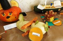 Для праздника Осени ребята подготовили прекрасные поделки из природного материала и овощей и фруктов. Здесь были и модели парусников и самолетов из кабачков, лесные ёжики из картофеля и виноградинок, гусеницы из оливок, веселые добряки-тыквы, и хмурые совы, а еще Чиполлино, Смешарики, и много других интересных поделок из кукурузы, рябины, свеклы, морковки, шишек, сосновых иголок. Ребята постарались на славу и доказали, что ручки у них очень умелые!