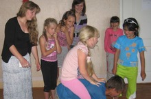 Во время игровой части были проведены игры - эстафеты, командные конкурсы. Детям очень понравилась игра «Гори-гори ясно…», где они с закрытыми глазами выбирали из корзины шуточную одежду и одевали ее на себя.