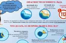 «Правила безопасного поведения на водоёмах» 01.11.2022 Осенний лед в период с ноября по декабрь, то есть до наступления устойчивых морозов, непрочен. Скрепленный вечерним или ночным холодом, он еще способен выдерживать небольшую нагрузку, но днем, быстро нагреваясь от просачивающейся через него талой воды, становится пористым и очень слабым, хотя сохраняет достаточную толщину. С образованием первого льда люди выходят на водоем по различным причинам: прокатиться по гладкой и блестящей поверхности на коньках, поиграть в хоккей, сократить маршрут и т.п. Но нельзя забывать о серьезной опасности, которую таят в себе только что замерзшие водоемы. Становление льда: Как правило, водоемы замерзают неравномерно, по частям: сначала у берега, на мелководье, в защищенных от ветра заливах, а затем уже на середине. На озерах, прудах, ставках (на всех водоемах со стоячей водой, особенно на тех, куда не впадает ни один ручеек, в которых нет русла придонной реки, подводных ключей) лед появляется раньше, чем на речках, где течение задерживает льдообразование. На одном и том же водоеме можно встретить чередование льдов, которые при одинаковой толщине обладают различной прочностью и грузоподъемностью. Следует знать, что: Безопасным для человека считается лёд толщиною не менее 10 сантиметров в пресной воде и 15 сантиметров в солёной воде. В устьях рек и притоках прочность льда ослаблена. Лёд непрочен в местах быстрого течения, бьющих ключей и стоковых вод, а также в районах произрастания водной растительности, вблизи деревьев, кустов, камыша. Если температура воздуха выше 0 градусов держится более трех дней подряд, то прочность льда снижается на 25 %. Прочность льда можно определить визуально: лёд голубого цвета – прочный, белого – прочность его в 2 раза меньше, серый, матово-белый или с желтоватым оттенком – лёд ненадёжен. Оказание помощи провалившемуся под лед: Самоспасение: Не поддавайтесь панике. Не надо барахтаться и наваливаться всем телом на тонкую кромку льда, так как под тяжестью тела он будет обламываться. Широко раскиньте руки, чтобы не погрузиться с головой в воду. Обопритесь локтями об лед и, приведя тело в горизонтальное положение, постарайтесь забросить на лед ту ногу, которая ближе всего к его кромке, поворотом корпуса вытащите вторую ногу и быстро выкатывайтесь на лед. Без резких движений отползайте как можно дальше от опасного места в том направлении, откуда пришли. Зовите на помощь. Удерживая себя на поверхности воды, стараться затрачивать на это минимум физических усилий. Находясь на плаву, следует голову держать как можно выше над водой. Известно, что более 50% всех теплопотерь организма, а по некоторым данным, даже 75% приходится на ее долю. Активно плыть к берегу, плоту или шлюпке, можно, если они находятся на расстоянии, преодоление которого потребует не более 40 мин. Добравшись до плавсредства, надо немедленно раздеться, выжать намокшую одежду и снова надеть. Если вы оказываете помощь: Подходите к полынье очень осторожно, лучше подползти по-пластунски. Сообщите пострадавшему криком, что идете ему на помощь, это придаст ему силы, уверенность. За 3-4 метра протяните ему веревку, шест, доску, шарф или любое другое подручное средство. Подавать пострадавшему руку небезопасно, так как, приближаясь к полынье, вы увеличите нагрузку на лед и не только 
