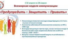Единая неделя иммунизации. О плановой иммунизации детей. 27.04.2022 Роспотребнадзор напоминает, что детей необходимо защищать от инфекций с раннего детства. Родители могут научить ребенка базовым навыкам гигиены, которые помогут сохранить жизнь и здоровье в будущем — мыть руки, соблюдать чистоту дома, вести здоровый образ жизни. Кроме этого, не стоит забывать про прививки. Вакцинации уже более 200 лет, а врачам вновь и вновь приходиться убеждать людей, что это нужно и полезно для здоровья. В современном обществе сформировался миф, что инфекционные болезни давно побеждены, а сейчас, в 21 веке, человечеству угрожают новые враги здоровья — ожирение, гипертония, инсульты, онкология, но это не так. Инфекционные болезни никуда не исчезли, а дети остаются для них самой уязвимой группой. Еще один миф, что детские инфекции для детей не опасны, ими можно и нужно болеть и чем раньше - тем лучше также не соответствует действительности. Некоторые инфекции могут быть очень опасными для детей и привести к смерти или тяжелым последствиям для организма. Это подтверждают объективные данные: в мире ежегодно 1,5 миллиона детей младше 5 лет погибают от инфекций, которые можно было бы предотвратить с помощью прививок. Родители, которые устраивают так называемые «ветряночные вечеринки», наверняка просто не знают о том, что осложнение ветряной оспы - ветряночный энцефалит может убить ребенка или сделать его умственно отсталым. Менингококковая инфекция – страшная болезнь, которая в течение нескольких часов может унести жизнь до этого совершенно здорового ребенка или сделать его инвалидом. Самые распространенные и опасные инфекции можно предотвратить, сделав прививки, а вакцинация признана самым эффективным медицинским вмешательством из изобретенных человеком. В нашей стране порядок вакцинации определен специальными документами - национальным календарем профилактических прививок и календарем профилактических прививок по эпидемическим показаниям. Они содержат информацию о том, кому, когда и от каких инфекций нужно прививаться. Национальный календарь профилактических прививок — это график вакцинации против наиболее опасных и заразных инфекций. Календарь профилактических прививок по эпидемическим показаниям — это дополнительный график вакцинации, составленный для особых случаев, например, для пребывающих в очаге инфекции людей, или в случае осложнения эпидемиологической ситуации. Каждый регион России, на основании национального календаря профилактических прививок и календаря профилактических прививок по эпидемическим показаниям, формирует свой, региональный календарь профилактических прививок. При этом учитываются особенности инфекционной заболеваемости на конкретной территории. Прививки, внесенные в этот календарь, делаются бесплатно, в соответствии с программой обязательного медицинского страхования. Помните, прививки, сделанные вовремя, позволяют избежать многих инфекций или перенести их в легкой форме. Роспотребнадзор напоминает, что инфекции, против которых проводится иммунизация детей, действительно опасны. От них нельзя защититься только с помощью витаминов, чеснока и правил здорового образа жизни. Помните, что вакцинация доступна для всех совершенно бесплатно в поликлиниках по месту жительства. Берегите детей и будьт