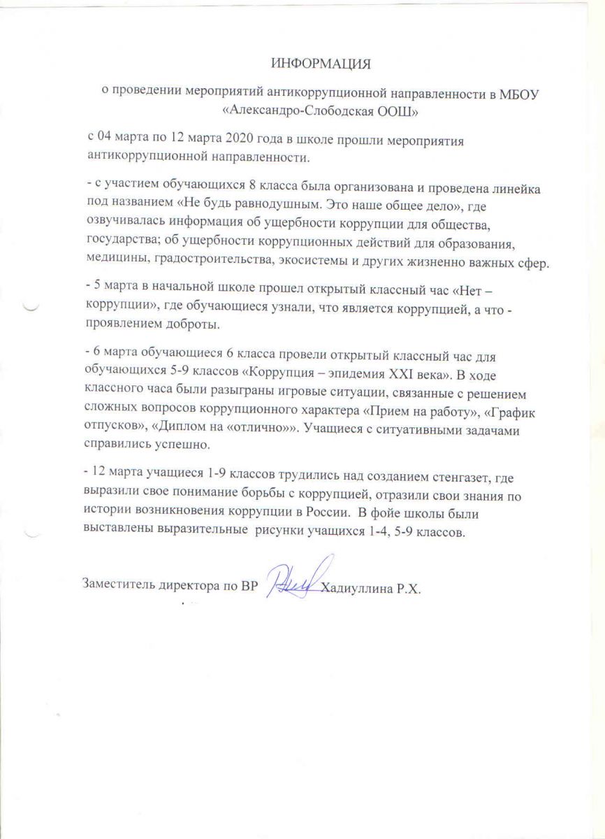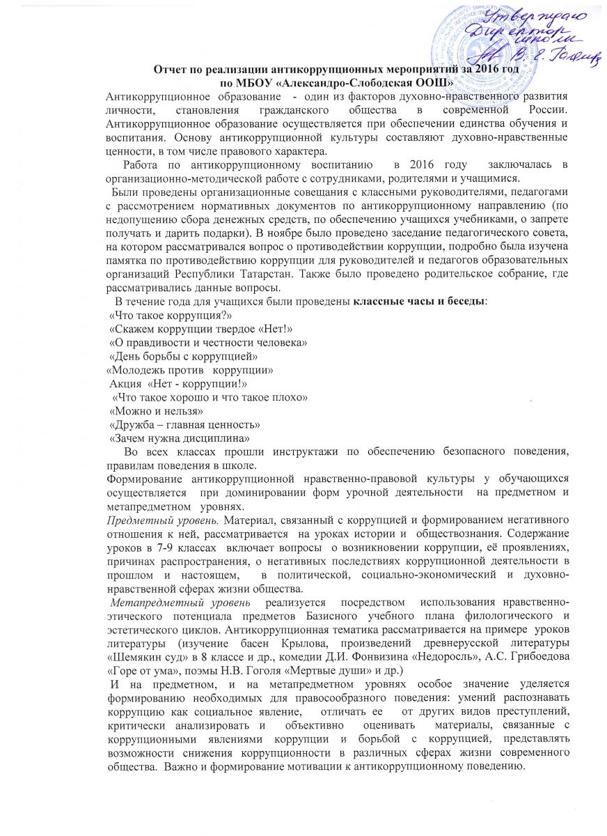 Отчет по реализации антикоррупционных мероприятий за 2016 год по МБОУ "Александро-Слободская ООШ"