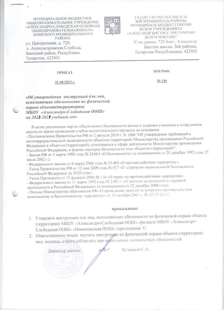Об утверждении инструкций для лиц, и.о.по физической охране объекта 2023-2024