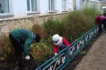 Бүген укучылар мәктәп территориясендәге яфракларны, кипкән чәчәкләрне җыештырдылар.