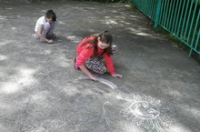 Сегодня дети рисовали на асфальте Солнце и были довольны своими результатами. Победителями оказались самые веселые и красочные рисунки.