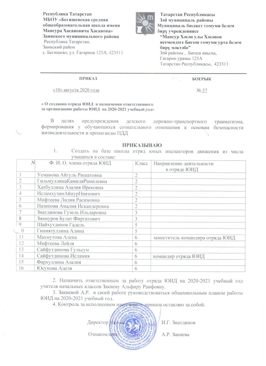 Приказ о создании отряда ЮИД на 2020-2021 учебный год