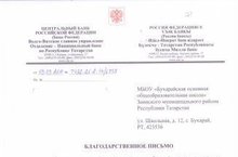 За развитие знаний и творческих способностей, повышение уровня финансовой грамотности молодого поколения, за достижение высоких результатов в работе Отделение - Национальный банк по РТ Волго-Вятского главного управления Центрального банка РФ выражает благодарность педагогическому коллективу МБОУ "Бухарайская ООШ" за активное участие в конкурсе школьных стенгазет, сочинений и рисункв на тему "Финансовая грамотность населения", проведенном среди учеников РТ.