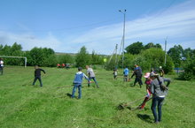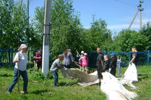 Кояшлы көннән файдаланып калырга теләп, хезмәт һәм ял лагерьына йөрүче балалар стадиондагы печәнне җыйдылар.