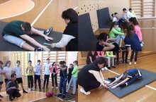Они соревновались в прыжках в длину с места, подтягивание на перекладине, сгибание и разгибание рук в упоре лежа, подъем туловища из положения лежа на спине за 30 секунд, наклон вперед из положения сидя, челночный бег. -
