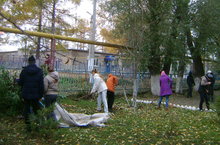 Матур көннәрдән файдаланып, өлкән сыйныф укучылары мәктәп территориясендәге яфракларны җыйдылар.
