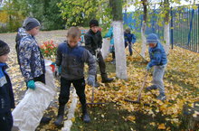 Башлангыч сыйныф укучылары мәктәп территориясендәге яфракларны, чүп -чарны җыештырдылар.