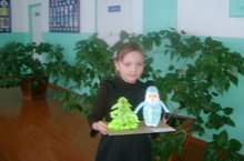 Беренче сыйныф укучысы Миникаева Камилә район күләмендә үткәрелгән "Яңа ел" бәйгесенә катнашу өчен төсле кәгазьләрдән Кыш бабай һәм чыршы ясады.