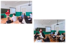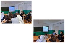 В школе прошла встреча со студентами. Они рассказали о своих направениях обучении, студенческой жизни. Играли интеллектуальную игру. В спортзале играли волейбол. -