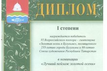 Поздравляем Дмитриева С.И., педагога отделения изобразительного искусства, занявшего 1 место в VІ Всероссийском пленэре – симпозиуме «Золотая осень в Бугульме», посвященного 235-летию города Бугульмы и 80-летию Союза художников Республики Татарстан в номинации «Лучший пейзаж золотой осени».